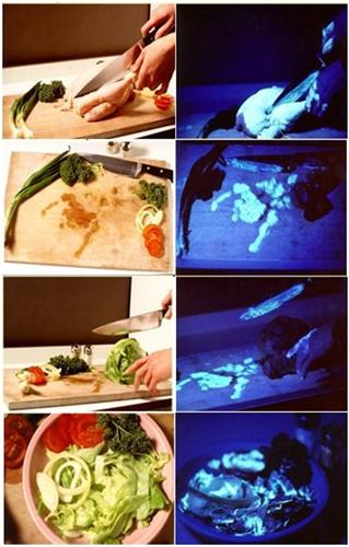 沙门氏菌交叉污染示意图:左图为正常拍摄,右图为紫外线下拍摄。荧光标记的沙门氏菌沾染鸡肉,在紫外灯下发出荧光。鸡肉上的沙门氏菌经案板、刀具和手污染蔬菜沙拉。