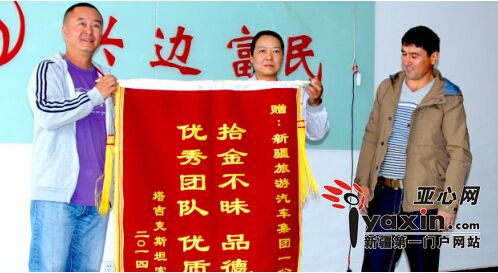 撒依德(右)向新疆旅游出租汽车(集团)有限责任公司送来一面锦旗。图为,一公司队长王建军和的姐王小云接受锦旗。豆兴军 摄
