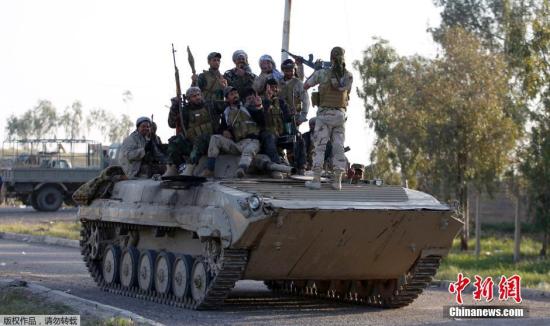 图为伊拉克安全部队与什叶派民兵在坦克上。