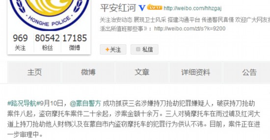 人民网北京9月11日电 据云南省红河州公安局官方微博消息,9月10日,红河州蒙自市警方成功抓获三名涉嫌持刀抢劫犯罪嫌疑人,破获持刀抢劫案件八起,盗窃摩托车案件二十余起,涉案金额十余万。