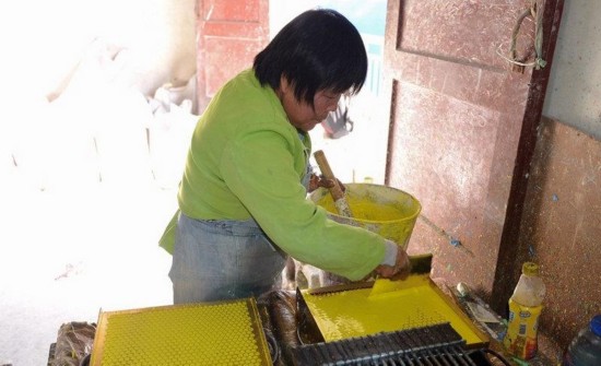 图为浆液在模具里静置四五分钟,就凝固成了粉笔,把模具翻个面,放到簸箕状的木制斗上。 任之 摄