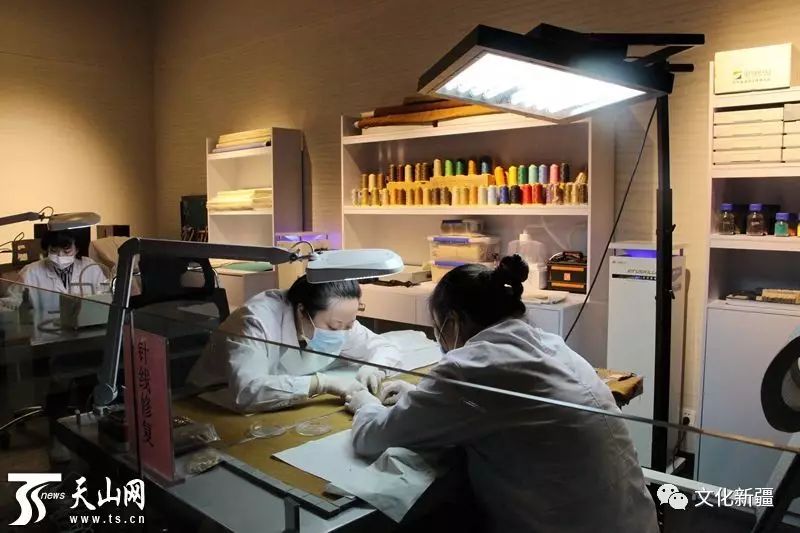 新疆维吾尔自治区博物馆科技保护中心纺织品组修复师正在修复文物。