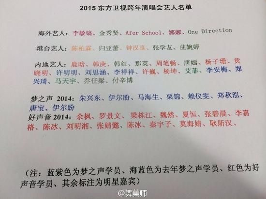 近日,知名爆料博主舞美师发微博称:“费力搞到了东方卫视跨年演唱会名单,确实有鹿晗!李敏镐金秀贤两位欧巴首度同台!陈柏霖、韩庚、钟汉良还有黄晓明都是国民老公级别的男神!梦之声联手好声音两档学员对垒,好男儿集体回家!这名单信息量略大啊!另外,李安梅和郑兴琦不是2014年#中国梦之声#学员么,为什么单独归在内地艺人里,难道…”引发网友热议。
