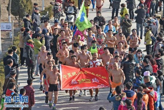 1月9日,一名选手在比赛中。当日,宁夏银川市近百名男女选手在寒冬里身着运动背心和短裤,环绕北塔湖进行全程4公里的“光身跑”比赛。 李然 摄