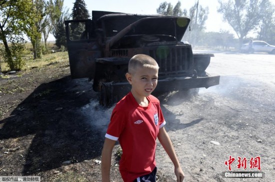 当地时间9月7日,乌克兰马里乌波尔,一座乌克兰军队的检查站受到袭击。图为一名儿童在被烧毁的军车前经过。