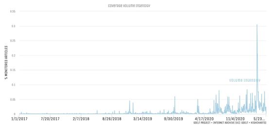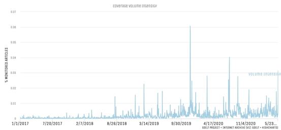 给中国新疆扣上“种族灭绝”的帽子到底是从什么时候开始的?Google开源大数据集GDELT显示,西方媒体关于新疆“种族灭绝”的报道从2018年下半年开始变得频繁起来,到2020年下半年密集爆发。