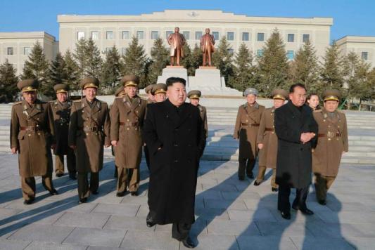 金正恩说,2014年在意义深远的航空节之际,朝鲜人民军航空与防空军指挥部“最先建立两位大元帅铜像”,反映了航空与防空军全体官兵发扬金日成和金正日革命业绩的决心。
