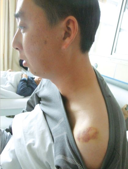 想着家里经济不宽裕,覃述建急了,跳上车,开车离开了现场。让他没想到的是,几名执法人员迅速驾车在后面追。“开始他们是两辆车,后面又来了一辆,三辆车追了我几公里路。”覃述建告诉记者,在车行驶到一个叫瑶池园的地方时,三辆城管执法车将他的车阻拦下来。当他准备给执法人员解释时,其中一名执法人员抓着他的衣服就开始打他。“我当时懵了,记不清谁先打的我,几秒钟我就被打翻在地。”他说,到现在他也记不得到底有几名执法人员打他。